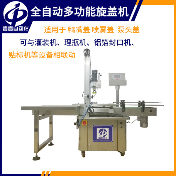 2、喷头旋盖机,稳定性强,解决了喷头、泵头、喷雾泵、手扣式喷枪旋盖难的问题,设有定位装置,旋盖标准,操作方便,锁盖范围宽,可锁不同形状规格的瓶盖,锁盖转速可调,可根据不同瓶盖调节松紧度,用于各种日化、医药、化工行业的喷头泵头喷雾泵手扣式喷枪瓶盖锁盖。